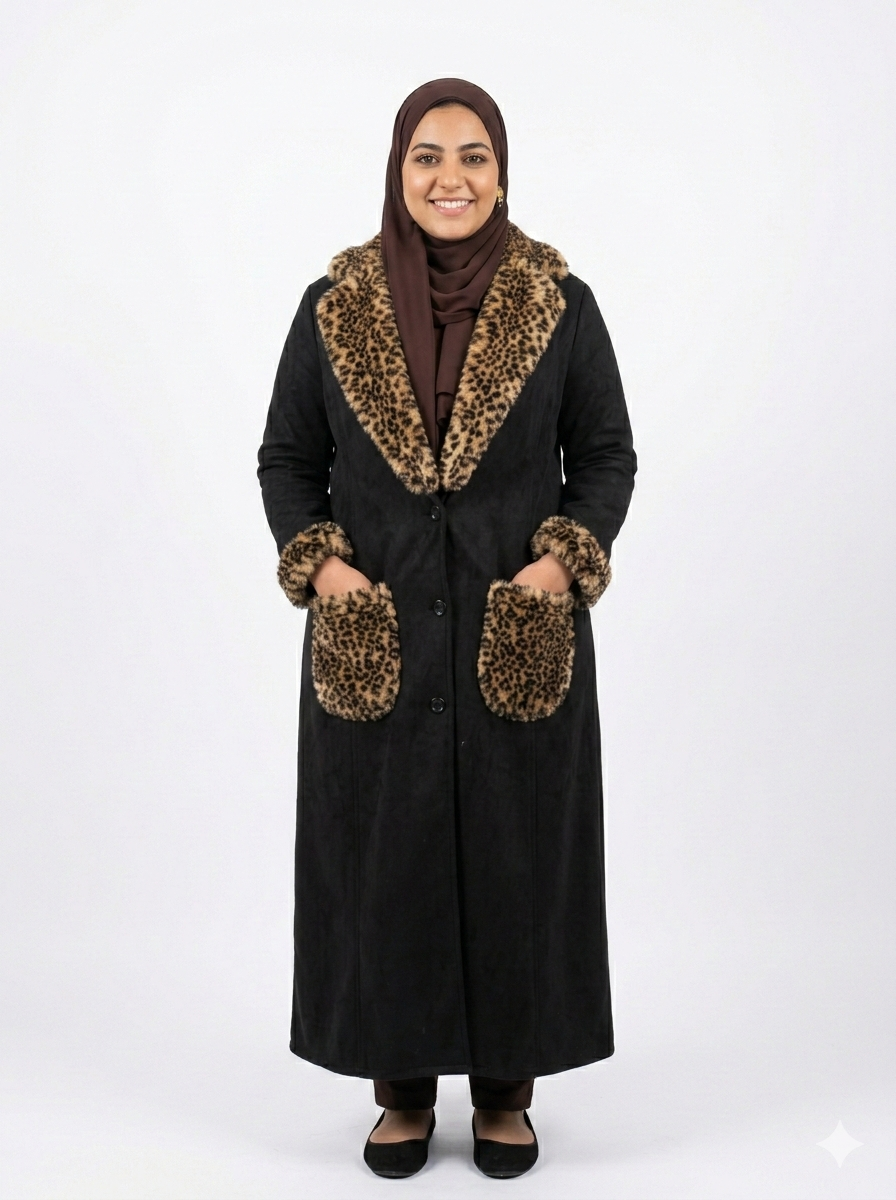 تألقي بإطلالة فخمة مع بالطو أسود طويل من الحرير الناعم، متزين بتفاصيل فرو التايجر الجريئة على الياقة والجيوب. اطلبيه دلوقتي وكملي شياكتك!